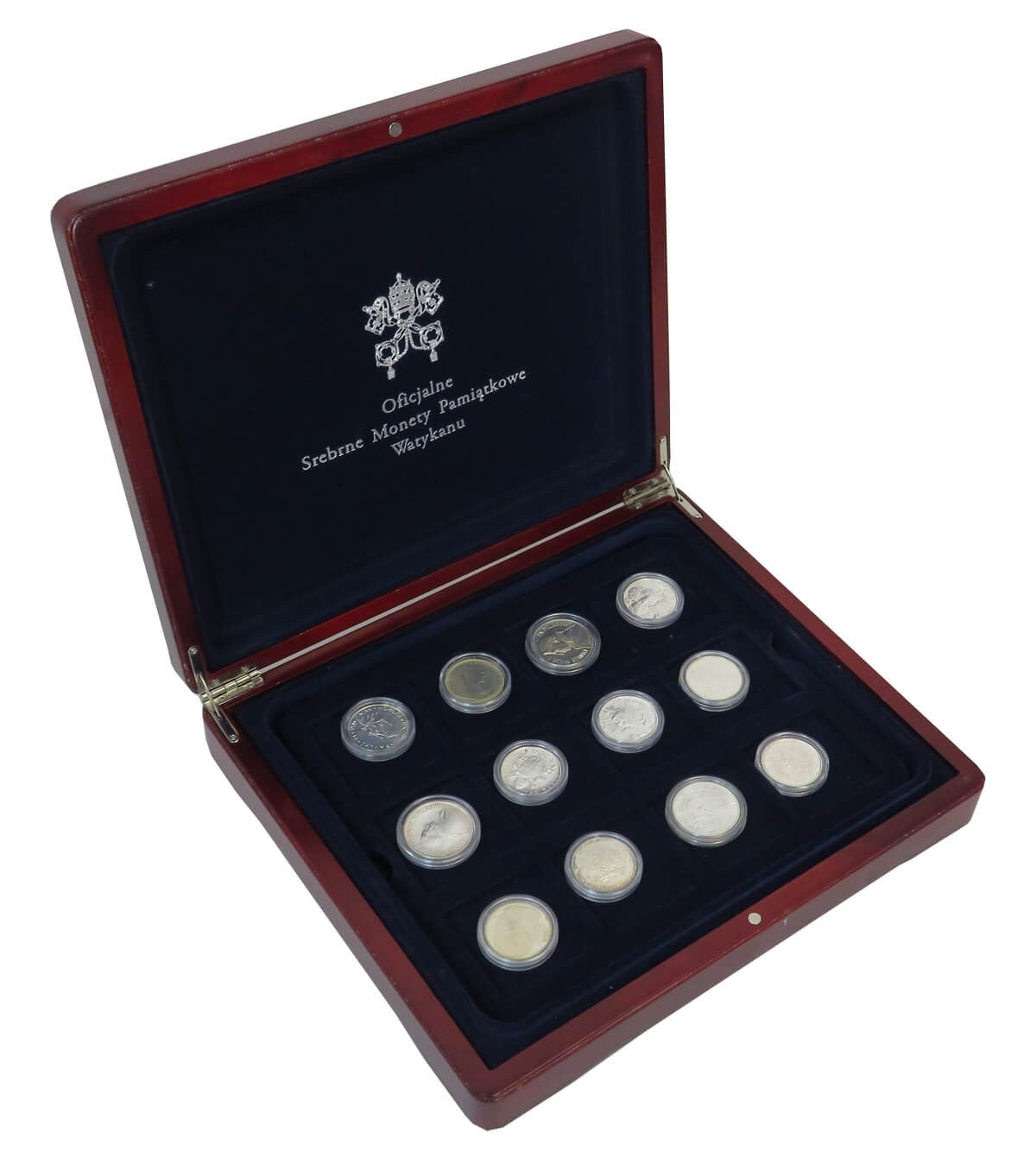 12 x oficjalne srebrne monety pamiątkowe Watykanu + kaseta + certyfikaty