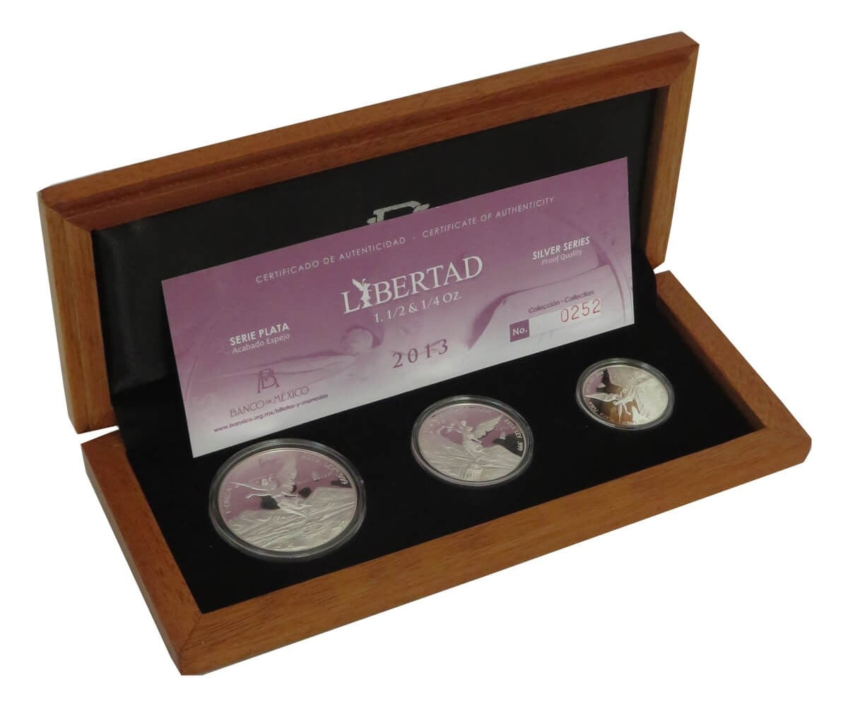 2013 Meksyk Zestaw 3 srebrnych monet 3Libertad (1+0,5+0,25 oz), drewniane pudełko, Ag999