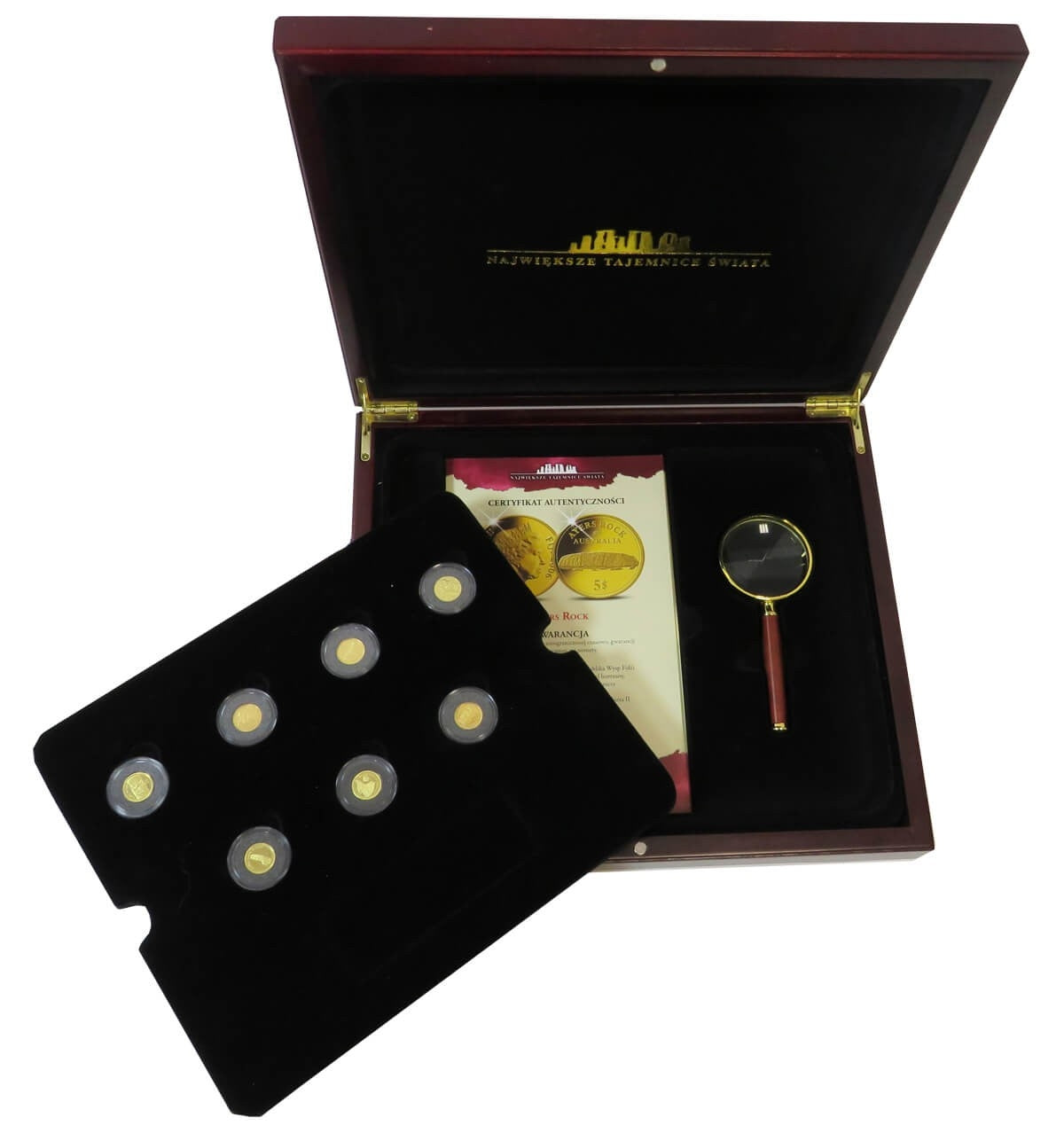 7 x złoto Największe Tajemnice Świata + kaseta + lupa, 7 x AU585